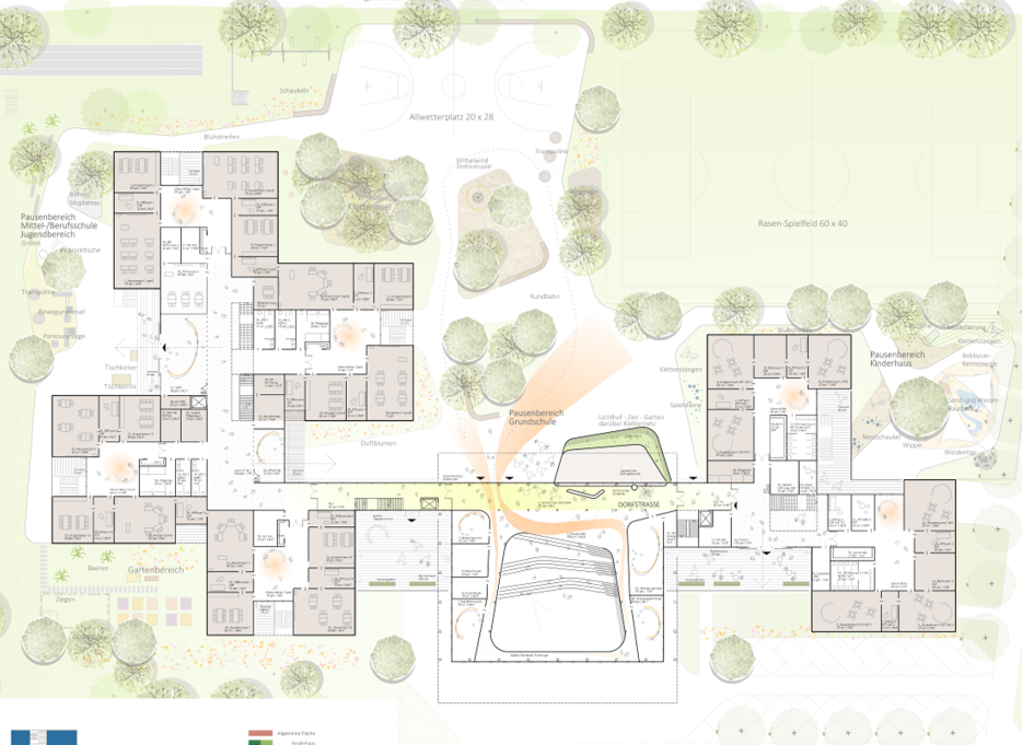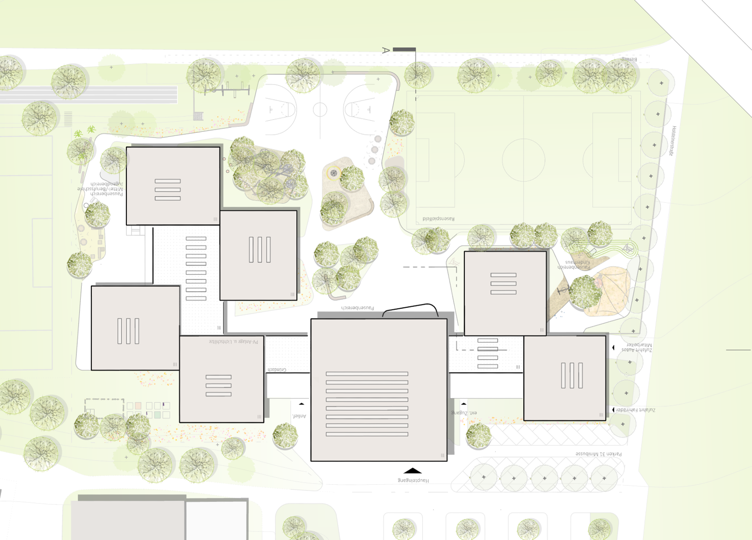 Die klare Gliederung der einzelnen Cluster fördern eine gute Orientierung im Quartier und gliedern den Außenraum in attraktive Räume mit differenzierbaren Angeboten. Neben diversen Pausenbereichen mit Sitz- und Liegemöglichkeiten bieten naturnah angelegte Spielanlagen die Möglichkeit sich körperlich auszutoben.