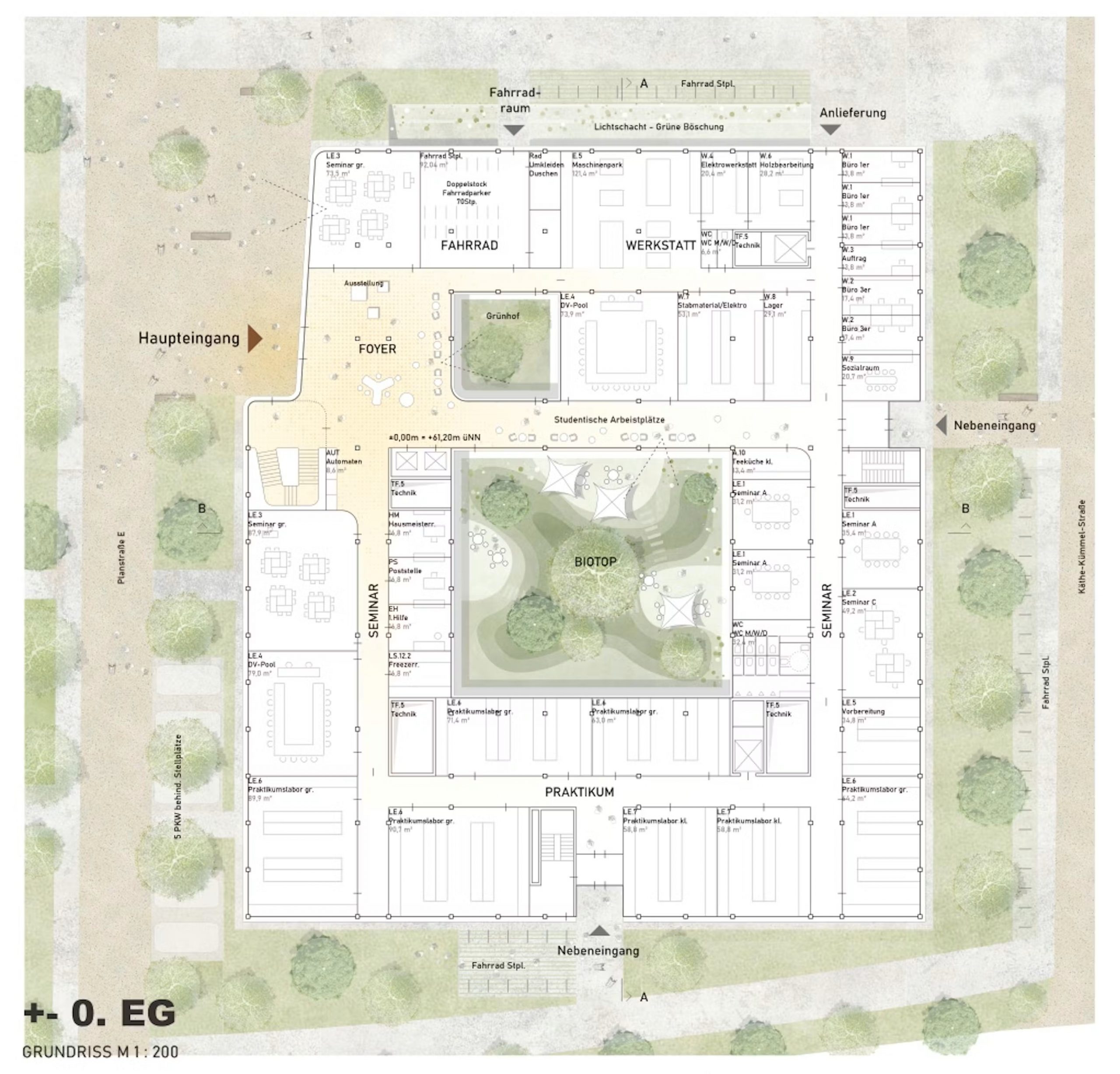 Städteräumlich öffnet sich das Gebäude nach Nordosten zum zentralen Campusplatz. Der durch seinen Rücksprung markierte Haupteingang stärkt die Verbindung zwischen Neubau und umgebender Bebauung. In Kombination mit dem großzügig angelegten Innenhof entsteht ein qualitätsvoll gefasster Stadtraum und ein identitätsstiftender Außenraum mit hoher Aufenthaltsqualität.