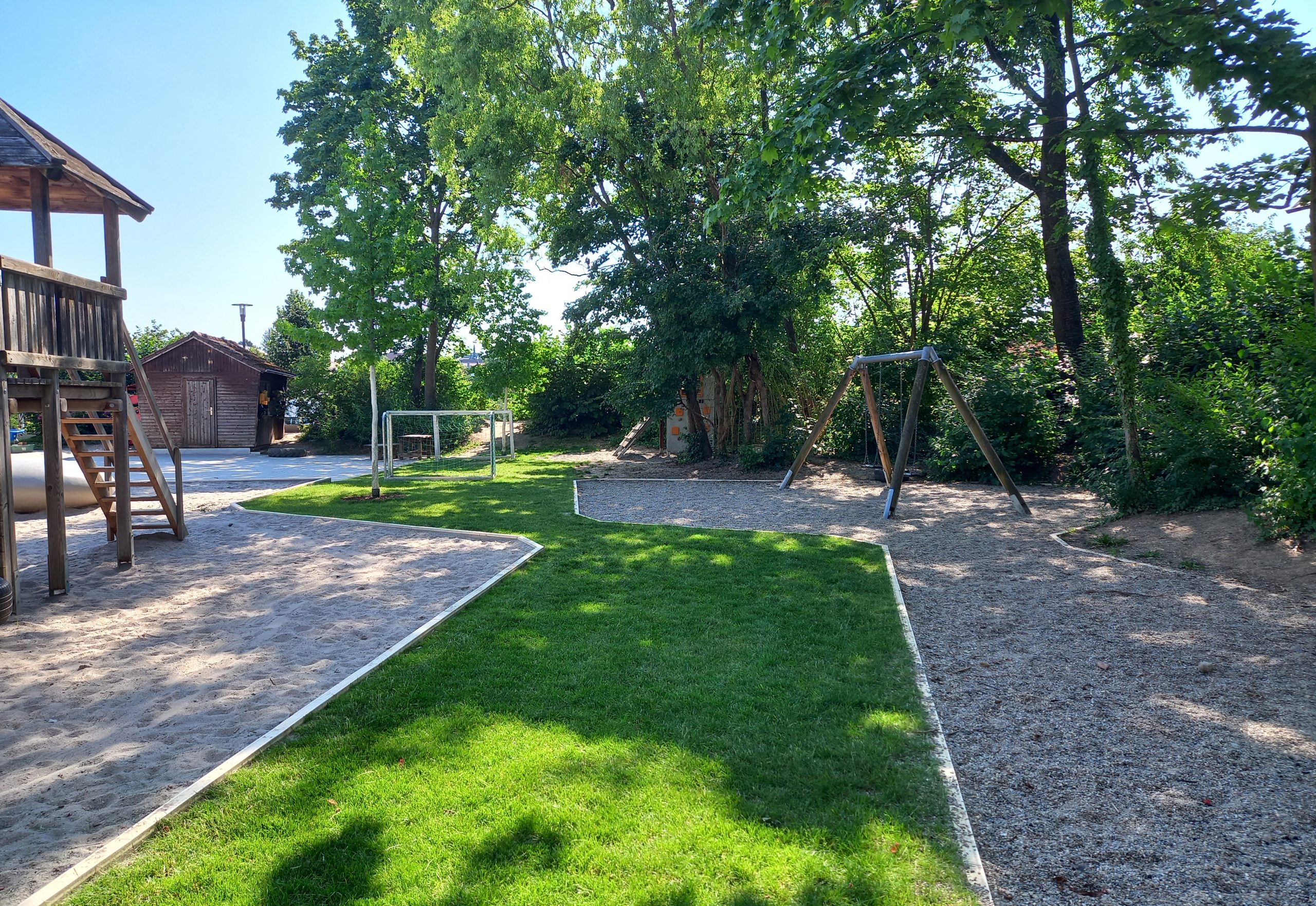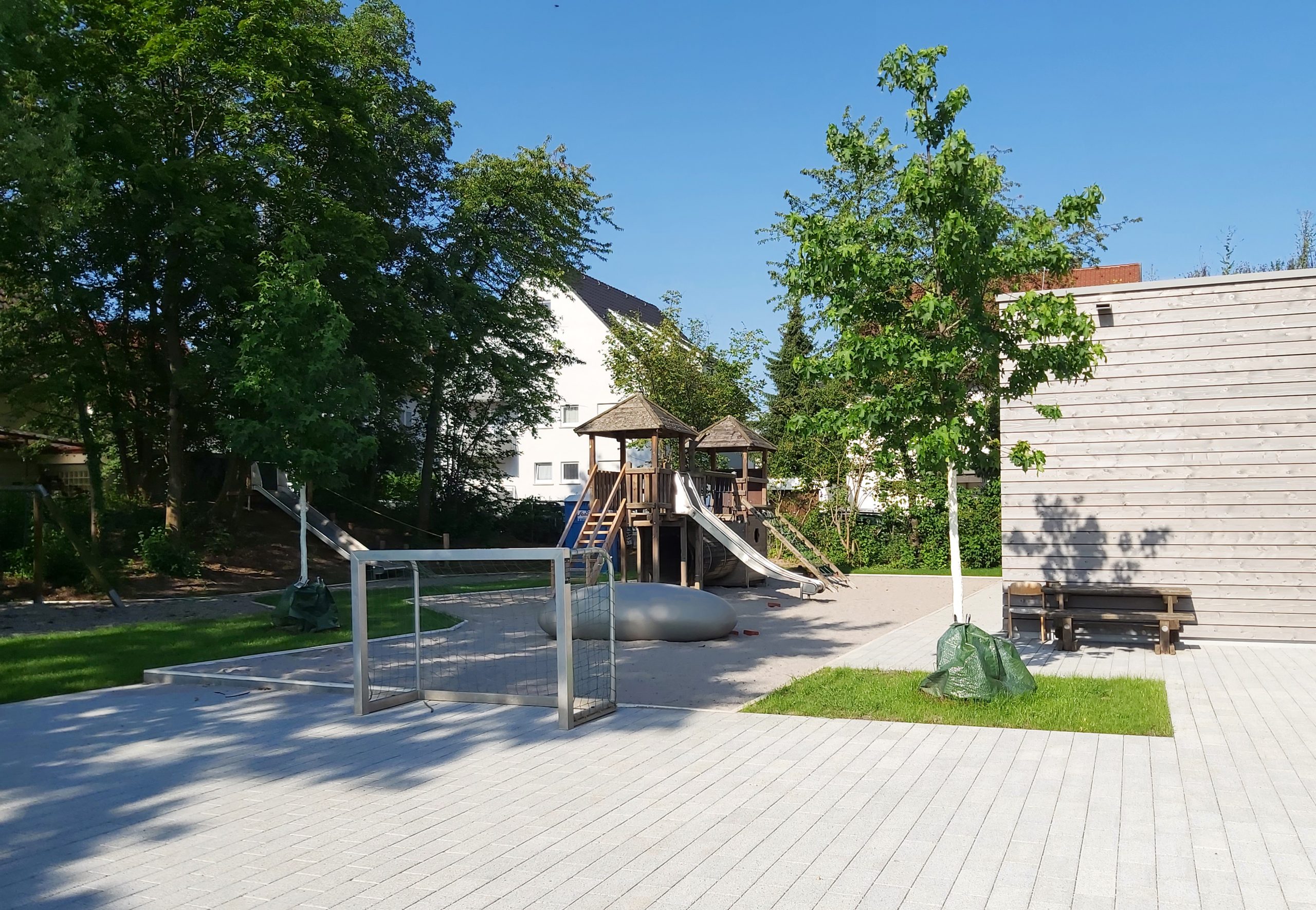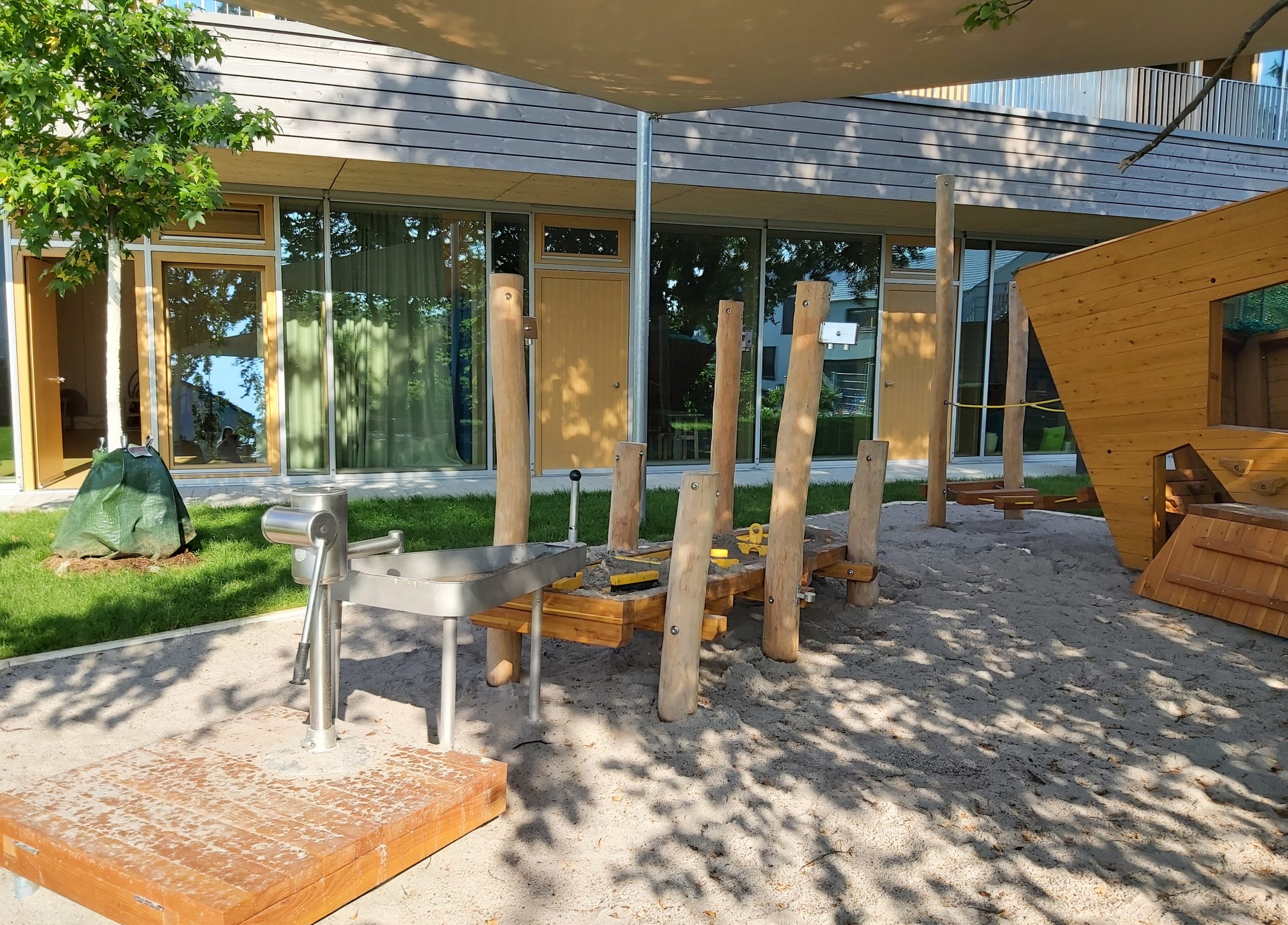 Die Außenspielfläche des Kindergartens gliedert sich aufgrund der Architektur in zwei Bereiche. Die kleinere Spielfläche ist auf der Ostseite gelegen und steht unter dem Thema Sand-/ Matschspiel. Eine Wasserrinne mit Stauelementen, sowie eine kleine Sandbaustelle bieten ein kreatives Spielangebot zwischen bespielbaren Grünflächen.